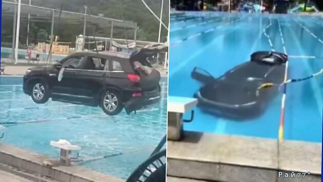 Согласно скудных данных, поступивших в Рай77° вместе с видеосюжетом, владелец легковушки перепутал педали, в результате чего опрокинул своё транспортное средство в бассейн.
