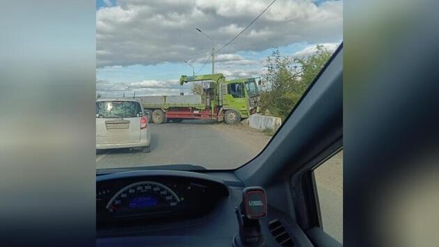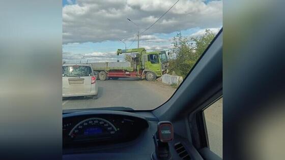 Большегруз не справился с управлением и въехал в бетонные блоки на дороге. Об этом корреспонденту ZAB.RU сообщил очевидец.