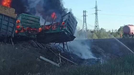 На предоставленном видео пожарные тушат возгорание, которое возникло на сошедших с рельсов вагонах.