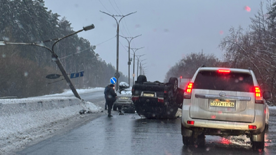 На одной из главных улиц Новосибирска внедорожник снес опору освещения и упал вверх колесами