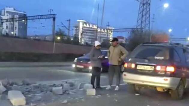 В Улан-Удэ водители напоролись на разбросанные блоки и попали на видео