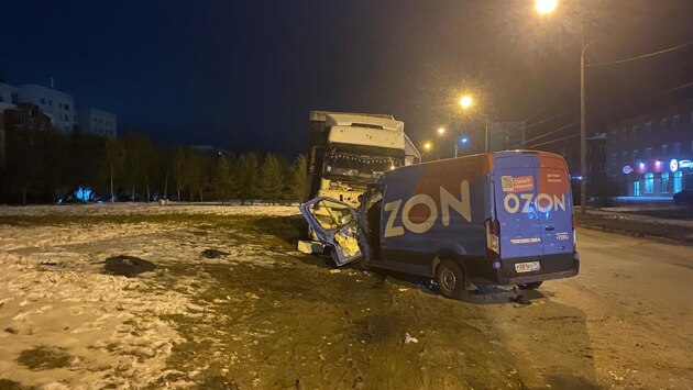 Автомобиль службы доставки крупного маркетплейса въехал в припаркованный на обочине грузовик
