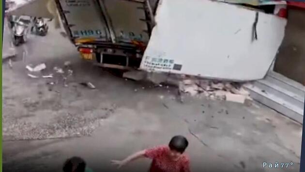 Две жительницы города Фучжоу (провинция Фуцзянь, КНР) чудом не оказались на пути у неуправляемого грузовика.