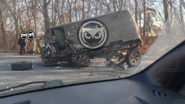 Очевидцы опубликовали в Сети кадры с места аварии. От удара «буханку» покорежило, Mitsubishi развернуло поперек полосы движения.