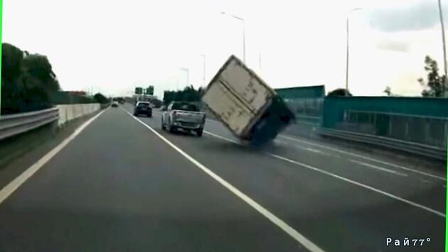 Житель Поднебесной, передвигаясь на небольшом грузовике, сменяя полосы движения, не удержал своё транспортное средство, которое чудом не придавило легковушку.
