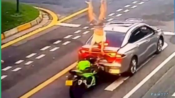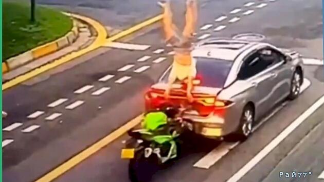 Примечательно, что несмотря на силу удара, падение мотоциклиста было смягчено кузовом автомобиля.