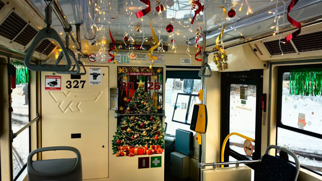 В перерывах между рейсами или после смены водители и кондукторы своими руками развешивали гирлянды, открытки и даже мастерили декоративные камины внутри салонов. Многие из них тоже надели новогодние костюмы. Например, по словам градоначальника, в одном из трамваев пассажиров встречает "Марфушечка-душечка" из сказки "Морозко".