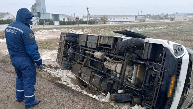 По предварительным данным, ДТП произошло утром 24 января на автодороге Евпатория — Черноморское в районе села Красная Поляна. 71-летний водитель автобуса СИМАЗ во время выполнения поворота не выбрал безопасную скорость, выехал на встречную полосу и допустил опрокидывание транспортного средства.