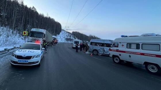 "По предварительным данным, столкнулись два большегруза и микроавтобус Hiace с пассажирами, следовавшими из Иркутска в Улан-Удэ. По имеющимся на данный момент сведениям, медицинская помощь понадобилась 12 участникам происшествия - водителю и 11 пассажирам автобуса", - говорится в сообщении ведомства.
