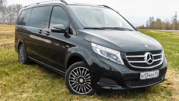 Черный V-Class (предоставлен официальным дилером «СТС Автомобили») предстаёт взору как нечто огромное, солидное, но интересное по своему дизайну. Спереди у него фирменные, оттянутые к низу фары, большая звезда на радиаторной решетке, мощный капот с центральным ребром. Капот этот и в целом вытянутый моторный отсек делают V-Class стремительным, спортивным, не таким, как обычные пузатые минивэны-коротыши. По всей боковине проходит стильная выштамповка. Все стекла, кроме передних, хорошенько затонированы. Диски симпатичные, но 18-е колёса маловаты. Сзади все достаточно просто и квадратно. Большое стекло и компактные фонари делают корму весьма внушительной. В салоне — царство пространства. Автомобиль длиной 5140 мм и шириной 1928 мм с высокой крышей и прямоугольными формами ставит объём фактически на первое место в списке главных своих функциональных характеристик. Между передними креслами здесь можно стоять. Над головой большое количество воздуха. Массивная передняя панель отодвигает далеко вперед лобовое стекло. Высокие окна, хороший круговой обзор, автомобиль возвышается практически над всеми участниками движения — ехать тут комфортно. Материалы отделки — стандартные «мерседесовские», качественные. Передняя панель не из кожи, но её пластик — без малейших изъянов. На дверях есть кожаные вставки, сиденья тоже кожаные. Есть и твердые материалы: низ дверей, панели задней части салона или вот эта чёрная вставка, обрамляющая джойстик мультимедиа и кнопки управления. Наверное, это самое слабое место в интерьере — пластик далеко не нарядный и может со временем пошоркаться. Кресла хороши боковой поддержкой — это совсем не лишнее в 2,2-тонном минивэне, который, разумеется, кренится в поворотах. Дополнительно помогают держаться индивидуальные подлокотники с регулируемой высотой. А вот подушки сидений коротковаты, ноги у рослых людей будут свисать. Посадка в автомобиль удобная, порожек расположен оптимально, но можно входить в салон и без него — просто садишься, не сгибаясь, и всё. Передние двери могли бы открываться на бо́льший угол. В задней части салона — пять мест, 1030-литровый багажник и множество вариантов трансформации. В центре — раскладываемый и регулируемый по высоте столик, который может двигаться по направляющим вперёд-назад. В компании 5 человек за этим столиком можно уютно расположиться и комфортно ехать на большие расстояния. Если столик не нужен — он опускается, его половинки складываются и убираются в тоннель, который задвигается между двух сидений, стоящих против хода движения. Эти сиденья, кстати, можно снять и развернуть по ходу движения. Задние сиденья можно сложить, получив огромную площадку, куда легко помещаются два велосипеда. И еще остается место для 2–3 взрослых велосипедов. Багажный отсек оформлен полкой с органайзером, которую можно поднять или вовсе убрать из салона для перевозки какого-то габаритного груза. Сдвижные двери оборудованы электроприводом — снаружи их можно открыть, просто слегка потянув за ручку. Водитель тоже может открыть двери, воспользовавшись кнопками на центральной консоли. V-Class со своим трансформируемым и объёмным салоном — это такой автомобиль на все случаи жизни. И большая семья, и габаритные грузы, и удобство путешествий по трассе — всё по плечу этому минивэну. Конечно, в большей степ