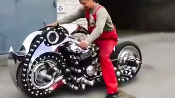 На изготовление в высшей степени необычного байка пошло несколько легковушек, хром с магистрального тягача и кое-что по мелочи от шаттла "Дискавери". Кастомайзинг – вселенная не имеющая границ, где каждый может найти или создать то, что угодно его душе. Подтверждением служит уникальный мотоцикл на видео, примерно в миллиардный раз подтвердивший, что фантазия кастомайзеров не знает никаких границ! Передняя часть мотоцикла с рычажной подвеской, а не традиционной вилкой слегка напоминает фантастическую птицу. Двигатель, насколько это можно разобрать, не V-твин, а рядный агрегат. Сзади сравнительно узкое колесо с цепным приводом и гигантский маятник. И, поверьте, это еще не самое безумное творение, родившееся в кастом-вселенной!