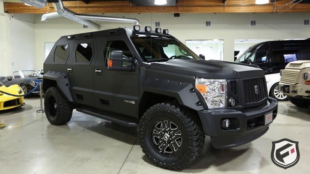 Пережить апокалипсис с комфортом? Чудовищный Rhino GX, который выставлен на онлайн-площадке eBay за 262 950 долларов, это может! Глаза вас не обманывают – в основу монстра, на фоне которого Bentley Bentayga и иже с ним кажутся изнеженными городскими пижонами, создан на основе полноразмерного пикапа Ford F-450. В частности, на родство указывает головная оптика и интерьер, который, к слову, заметно перелопачен и облагорожен. Черный внедорожник 2016 года рождения, смахивающий на настоящий броневик, проехал всего 95 километров. Он заряжен 6,7-литровым турбодизелем Power Stroke, агрегатированным с пятиступенчатой автоматической коробкой передач. В боекомплект входит полный привод, амортизаторы Bilstein (передняя подвеска Rhino GX во многом напоминает заводскую, а задняя основательно модифицирована) и усиленные тормозные механизмы, скрывающиеся за 20-дюймовыми колесными дисками. Основная часть кузовных панелей выполнена из стали, а из композита, в частности, изготовлены передние крылья и расширители колесных арок. Рама, моторный щит, передние и центральные стойки модифицированы. В салоне, чье роскошное убранство контрастирует с суровым экстерьером, есть раздельные кресла второго ряда с многочисленными электрическими регулировками, акустическая система Alpine, светодиодная подсветка и другие блага.