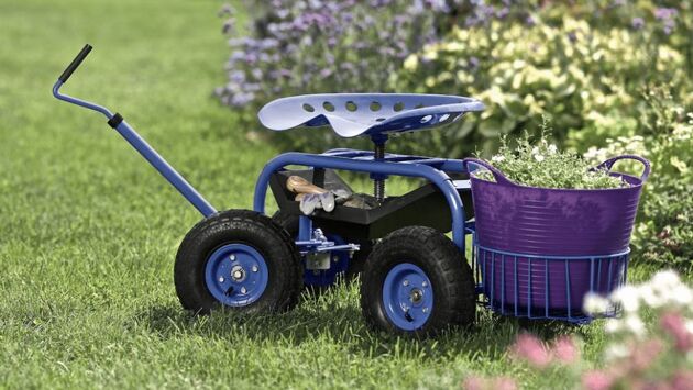 Работа на садовом участке многим приносит радость и удовлетворение. Но процессы прополки и посадки — это серьезное испытание для поясницы и коленей. Значительно облегчить труд цветовода-огородника призвана тележка с сиденьем Scoot, которая перевозит инвентарь и посадочный материал, а также дает возможность работать сидя, сводя к минимуму нагрузку на спину и ноги. Сиденье закреплено на трубчатой стальной раме, установленной на четырехколесном основании. Тележку можно возить за собой с помощью регулируемой по длине ручки, служащей также опорой при вставании. Под сиденьем имеется вместительный стальной лоток для садового инвентаря, а сбоку крепится сетчатая корзина, куда можно поставить ведро объемом до 22,5 л и складывать туда сорняки, черенки и луковицы для посадки или собранный урожай. Благодаря устойчивому основанию и большим (диаметром 25 см) прорезиненным колесам, тележку легко и удобно перемещать по огороду, а расстояние между колесами в 34 см дает возможность свободно катить ее между грядками. Передние колеса способны поворачиваться, позволяя маневрировать во время передвижения. Сиденье выполнено из прочного пластика и имеет анатомически правильную форму. За счет специального механизма, Scoot можно регулировать по высоте в зависимости от роста пользователя. Грузоподъемность тележки с сиденьем — до 180 кг. Сама она весит 16,8 кг и поставляется в разобранном виде в компактной упаковке. Для сборки понадобятся отвертка с большой плоской головкой (шлицевая), ключ ½" или разводной, а также плоскогубцы. Цена: $ 89,9.