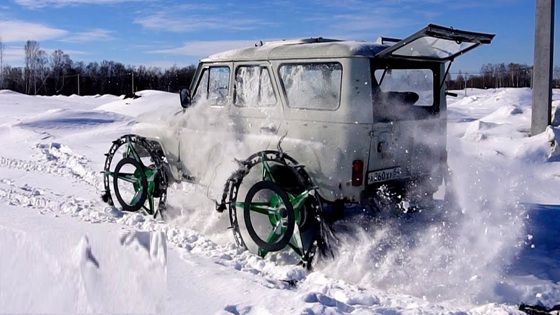 YouTube-канал «Гараж 54» нашел теоретический способ преодоления метровой толщи снега. Литые колесные диски, низкопрофильные шины… А как насчет роторно-фрезерного движителя? По сути это узкие металлические роторы, выглядящие как огромные дисковые фрезы. Они прорезают толщу снега, позволяют добраться до грунта и таким образом двигаться вперед. Мастера «Гаража 54» изготовили нечто подобное для установки на УАЗ и испытали конструкцию в полях при глубине снега около 80 см и больше. На некоторых, достаточно ровных участках автомобиль действительно едет, но возможности его на железных колесах не безграничны. Достаточно упереться в сугроб передним мостом, чтобы УАЗ обездвижился. Есть и другой недостаток — в отсутствие гидроусилителя управлять автомобилем с роторно-фрезерными движителями очень сложно.