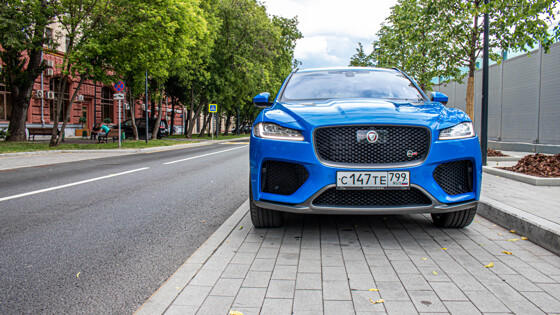 Когда в 1994 году на свет появился первый кроссовер, получился своеобразный эффект бабочки. Японская бабочка, взмахнувшая крылом в прошлом, породила настоящую бурю в будущем. В наши дни кроссоверы захватили мир. Помимо порождения все новых ниш внутри собственного сегмента, они активно топчут менее выносливых четырехколесных собратьев, приносящих своим создателям меньше золота. В итоге мы имеем кроссоверы-купе, кроссоверы-спорткары и даже кроссоверы-суперкары люксовые бренды просто вынуждены производить их, чтобы окупить производство и тех моделей, которые десятилетиями делали им имя. Однако в Jaguar Land Rover к происходящему относятся с воистину британским спокойствием. Насыщенный синий цвет кузова, диски 21 дюйм, красные суппорты и пара двойных насадок на выхлоп в заднем бампере в комплекте с V8 под капотом обычно являются верным признаком спорткара. И неплохого такого спорткара. Однако в данном случае ко всему вышеперечисленному прилагаются две тонны веса, 15 сантиметров клиренса и салон, который легко вмещает пятерых взрослых причем сзади остается место для 650-литрового багажника. Jaguar F-Pace SVR воспринимается примерно так же, как Её Величество Королева Елизавета II на фоне онлайн-автоспорта и общения в социальных сетях. Но для Туманного Альбиона это в порядке вещей находить смысл даже в самых странных традициях. Все в F-Pace SVR закручивается вокруг 5-литрового V8 с компрессором, к которому весьма кстати приделали довольно звучный выхлоп. Примечательно, что добавить звучанию злости и децибел можно при помощи специальной кнопки на центральной консоли. Есть ощущение, что большинство владельцев SVR были бы не против, если бы кнопкой звук не увеличивался, а уменьшался. Потому что сейчас она чаще всего находится в положении вкл. Аудиосистема Meridian с сабвуфером и 12-канальным усилителем часто остается не у дел: слушать грозный рокот выхлопа одно из главных удовольствий пилота SVR. Удивительное дело, но 550 лошадей и 680 Нм крутящего момента умеют разгонять двухтонный кроссовер до сотни за 4,3 секунды. И, кажется, если бы здесь появилось что-то вроде мягкого гибрида, заполняющее тот момент, который нужен компрессору для запуска в полную силу, эти три десятых превратились бы в ноль. Но и без того ощущения удивительные. Сидя в спортивном сиденье с отличной боковой поддержкой, перед поворотом невольно ждешь стандартного для большого кроссовера крена, но заходишь по нужной траектории без каких-либо проблем. Конечно, злоупотреблять этими способностями не стоит: все же центр тяжести у F-Pace высоковат для настоящих безумств. Но может ведь! Между тем, разрешите доложить, что Jaguar F-Pace SVR - это не совсем про спорт, как может показаться со стороны. Точнее, совсем не про спорт. За "спорт" у нас отвечают немецкие товарищи, у которых даже для этого сегмента припасены волнующие истории про секунды на круге. А в Jaguar все про комфорт и удовольствие. Удовольствие от того, что даже на крупном семейном кроссовере можно быстро и красиво уехать, привлекая к себе всеобщее внимание не только внешним видом, но и внешним звуком (никаких синтетических саундтреков из динамиков). А можно в режиме Eco не спеша ползти в пробке, экономя топливо для свободного пространства. Мой рекорд расхода по городу составил 12 л на сотню (хотя скучно было жуть). А чтобы характер F-Pace SVR проявился полностью, во все