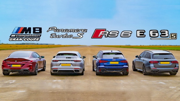 Обозреватели YouTube-канала carwow устроили сражение между четырьмя немецкими полноприводными моделями с V8. В дрэге сопоставили новые BMW M8 Gran Coupe Competition и Audi RS6, а также Mercedes-AMG E 63 Estate и Porsche Panamera Turbo S E-Hybrid Sport Turismo. По традциии, спорткары соревновались в четырёх дисциплинах. BMW M8 Gran Coupe Competition — четырёхдверная топ-версия «восьмёрки». Под капотом 625-сильный (750 Нм) 4,4-литровый турбомотор V8, трансмиссия — 8-ступенчатый «автомат». Баварский седан весит 2054 килограмма и стоит от 121 тысячи фунтов стерлингов. Новый Audi RS6 Avant — умеренный гибрид с 48-вольтовым стартер-генератором. Отдача 4,0-литровой «битурбовосьмёрки» — 600 сил и 800 Нм. Коробка передач — 8-диапазонный «автомат». Audi на 20 килограммов тяжелее, чем BMW, но существенно дешевле — RS6 обойдётся в 102 тысячи фунтов стерлингов. Porsche Panamera недавно пережила рестайлинг, но гибридную топ-версию Turbo S E-Hybrid обновление пока не коснулось. Заряжаемая бензин-электрическая установка выдаёт 680 лошадиных сил и 1000 Нм, тяга передаётся через 8-скоростной «робот». Универсал Porsche тяжелее и дороже конкурентов: масса — 2400 килограммов, цена — от 141 тысячи фунтов стерлингов. Mercedes-AMG E 63 S Estate в июне также обновился, но быстрее после рестайлинга не стал. Под капотом 4,0-литровый турбомотор, мощность — 612 сил, крутящий момент — 850 Нм. Коробка передач — 9-скоростной «автомат». Mercedes-AMG стоит от 100 тысяч фунтов и весит всего 1940 килограммов. Видео: YouTube-канал carwow В дрэг-гонке с места на четверть мили три модели разделили 0,2 секунды. Два спурта с хода и оценка эффективности торможения со скорости 113 километров в час победителя не помогли выявить абсолютного победителя — заезды закончились с итоговым счётом 2:2.