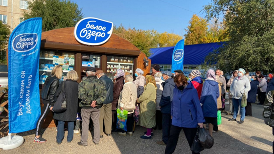 Молочный завод «Белое озеро» в день пожилого человека, в Оренбурге раздал 1000 литров пакетированного молока всем пришедшим на рынок «Горизонт».