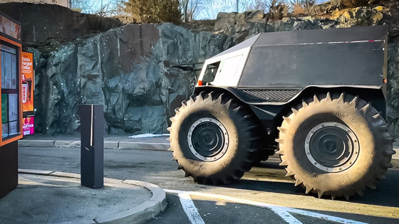 Следующей остановкой стал Макдоналдс. Как и в случае с пончиками, получить заказ блогеру удалось, лишь покинув кабину вездехода. Затем мужчина отправился на заправочную станцию, в процессе движения собрав за собой целую колонну автомобилей. На автозаправке ему пришлось помучаться с парковкой, чтобы топливный шланг доставал до бензобака. В конце видеоролика блогер сделал вывод, что Sherp, хоть и является довольно компактным вездеходом с высокой проходимостью, однако для городских условий является не совсем подходящей машиной.