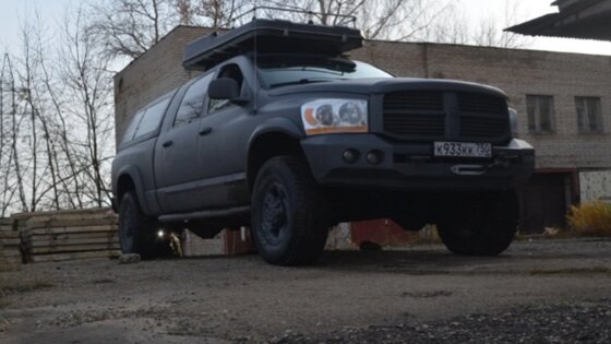 Американский пикап получил не самые симпатичные передние фары, но общий вид машины затмевает собой эту малопривлекательную деталь. На крыше есть небольшой багажник. Установлены два силовых бампера, а в переднем имеется усиленная лебедка, а под картером находится клиренс в 225 см, что вполне неплохо. Ram 1500 2006 года можно считать просторным и крепким внедорожником, который успешно проедет по лесам и горам, пусть и не преодолеет болота, хоть и создавался он для путешествий.Важно отметить наличие рессорной жесткой задней подвески и амортизаторов Bilstein, обеспечивающие мягкий ход даже по плохой проезжей части. Салон пикапа в неплохом виде, на дверных картах нет следов износа, передние кресла во время прежнего ремонта заменили на аналоги от BMW, что довольно спорно, так как они больше спортивные, а люди привыкли, что в американских машинах можно свободно находиться без каких-либо неудобств.