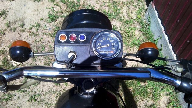 "Днепр" являлся единственным конкурентом "Урала". Слева от спидометра расположен замок зажигания, а цветовые индикаторы аккуратно вынесены в один ряд в нижней части "приборки".