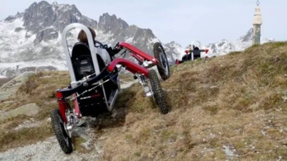 Модель может на поворотах наклоняться по принципу мотоцикла. Электрокар преодолевает подъемы с уклоном до пятидесяти градусов, осуществляет движение в поперечном направлении, а также расщепляет колесные пары.