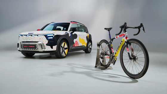 И это не просто машина, раскрашенная в цвета спонсора. Каждая линия кузова повторяет аэродинамические изгибы Trek Madone — того самого велосипеда, на котором команда Lidl-Trek боролась за победу в этом году. Яркие красные, жёлтые и синие полосы — не случайные мазки, а точное воспроизведение фирменной гаммы команды. Даже колёсные диски получили спицевый рисунок, напоминающий велосипедные колёса.