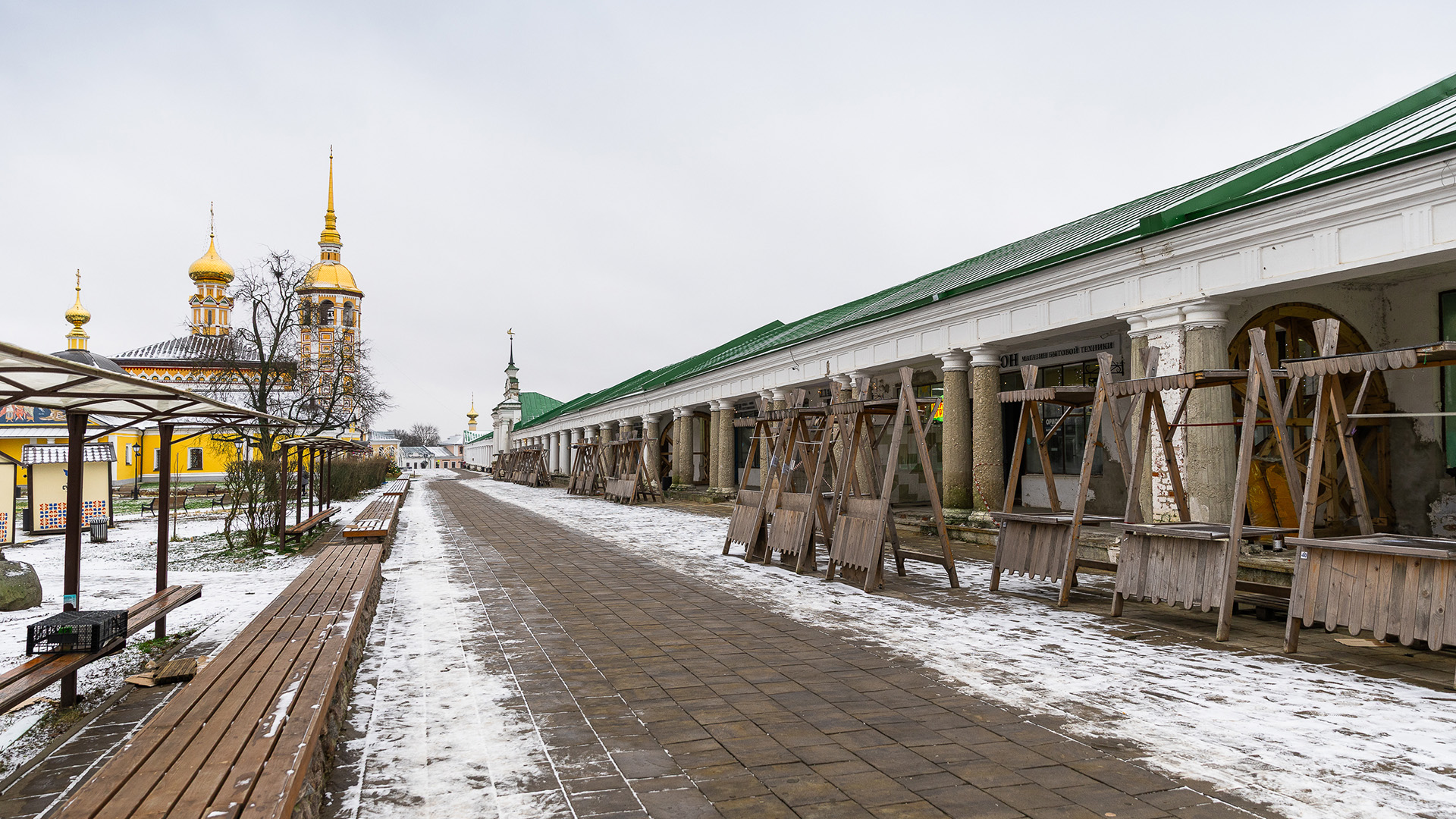 В центре Суздаля находятся местные торговые ряды —архитектурный и исторический памятник, построенный в XIX веке. Это комплекс каменных одноэтажных построек с арками и магазинами, расположенных вдоль центральной улицы города. Ряды служили местом торговли ремесленными изделиями, продуктами и сувенирами, объединяя в себе функции рынка и торгового центра того времени.
