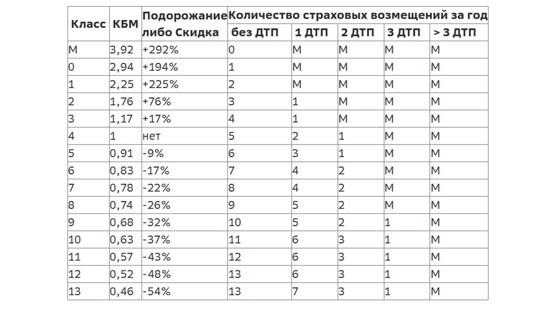- Водитель класса «13» с самым маленьким КБМ, равным 0,46, совершив всего лишь одно ДТП за год, 1 апреля отправляется в класс «7» с КБМ 0,78. За две аварии в год его опускают до уровня КБМ начинающего водителя – в класс «3», КБМ 1,17. За три ДТП он автоматически отправляется в класс «1» (КБМ – 2,25), а если устроит более трех дорожных происшествий, то окажется в классе «М» с максимальным КБМ, равным 3,92.